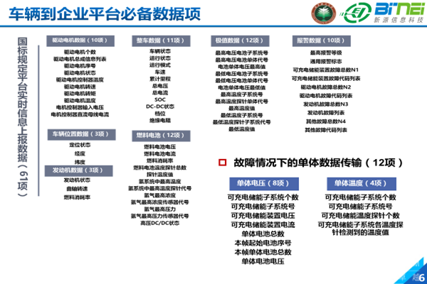 国家平台功能要求主要是四块内容,第一是安全和质量的监测,第二个是数据的信息服务,第三块是车辆数据的统计以及给政府的政策支持,最后一项是数据对接测试的能力验证。从车辆的安全监管来说,标准里也明确规定了有61项加12项;正常的过程当中,实际上只要求左边的61项,右下角这个是在车辆出现故障之后,能够把车辆更详细的数据进行监测,进行故障数据的回溯,来便于故障之后的技术数据分析。