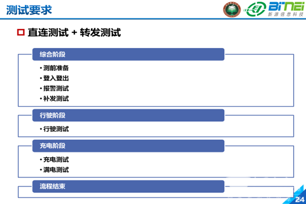 第三,国标的测试技术工作。车辆的测试有两个层次的要求,第一是从车到国家平台,第二个是车到企业平台,转发到国家平台比较,即直连和转发两种测试,整个测试过程基本按照两步完成。实际上测试的内容是完全一致,因为所遵循的标准内容是相同。主要分3个阶段,第一是综合阶段,包括它的车辆的登入和登出;核心报警测试,因为在标准里面有明确的规定,当出现三级故障之后,应该是把故障点前30秒、后30秒的相关数据以每一秒一帧的间隔进行数据上报,保证故障点前后能够有完整的数据,支撑故障数据的追溯和技术分析;在其他时间也是为了节约流量等相关方面的综合考虑,按照每30秒进行数据传输。其他几个阶段就是在行驶测试、充电测试、以及满电测试,主要是整车自身的技术状态发生变化后其状态标识是否满足技术标准要求,因为这些也涉及到后面的统计和分析以及在充电运行等等过程节点的划分。从数据整体校验方面,主要检测传输数据的内容格式、完整性、准确性、一致性和稳定性,这些是保障数据真实、有效、完整的核心,为故障的回溯和技术分析提供较为完整的数据链。