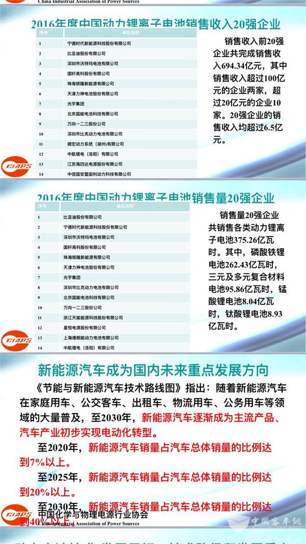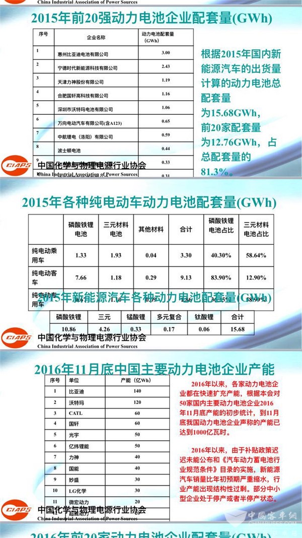 到2016年11月底,我们对国内一些主要的动力电池企业的产能也作了初步的统计,大概50家企业整个的产能应该超过了1千亿瓦时。另外2016年可能是受政策变化和行业目录管理的一些影响,整个行业应该出现这种结构性的过剩。一些中小的企业处于一种停产或者半停产的状态。