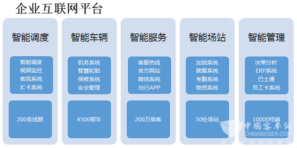多年来,青岛公交集团积极探索企业智能化管理架构,成立城市公共交通发展研究院,规划推动企业信息化智能化建设和管理。先后实施了智能调度、视频监控、IC卡收费、OA办公、ERP管理(营运、机务、保修、人力资源、物资供应、预算、计划生育、安全、工会、企业管理、服务、稽查、基建等模块)、统计系统、决策分析、客服热线、收银系统、就餐系统、加油系统、职工卡管理、轮胎管理、考勤、微信、网站、视频会议系统、巴士通、智能出行APP等30多个应用系统或模块,建立起包含30个应用系统的庞大的智能管理“云”平台。集团互联网应用覆盖60处场站、1000多台PC、5000多套车载设备、10000多台手机。现已基本形成“智能调度、智能车辆、智能场站、智能服务和智能管理”五大体系,全面支撑 “互联网+青岛公交”战略,促进互联网技术与企业经营管理各板块加速融合,以互联网引领企业转型升级、创新发展。