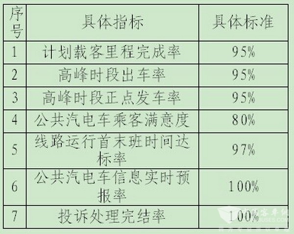 公交企业运营服务质量考核绩效由“数量考核”与“质量考核”组成。日常考核两个月进行一次,其中数量指标包括高峰时段出车率、高峰时段正点发车率两项指标;质量指标包括服务设施完备率、运营服务合格率、车辆整洁合格率、公交企业驾驶员工资实发率、公交企业驾驶员实际配置率等五项指标。年度考核指标包括数量指标和质量指标。其中,年度考核数量指标包括计划载客里程完成率、高峰时段出车率、高峰时段正点发车率等三项指标;年度考核质量指标包括线路运行首末班时间达标率、公交车辆中途故障率、公共汽电车责任事故死亡率、公共汽电车责任事故率、公共汽电车信息实时预报率、投诉案件数占运营里程比率、投诉处理完结率、车载智能终端使用率、企业基础管理等九项指标。