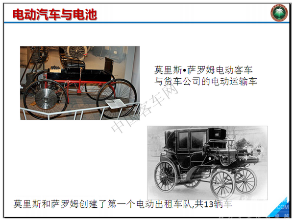 1891年,美国宾夕法尼亚州人莫里斯打造出第一辆电动四轮车,实现了由三轮向四轮的过渡,可以说是现代汽车的一个雏形。随即,他和同乡萨罗姆成立了电动客车与货车公司。公司的车队都由电动小货车改造而成,后轮大前轮小,总重1928公斤,所用动力源由60个总重726公斤的酸性电池组成,总容量达到100安时(安时即安培小时,一般指蓄电池容量),使用通用电气公司的3马力电动机,短时使用功率可达到9马力,车速通过电压控制。
