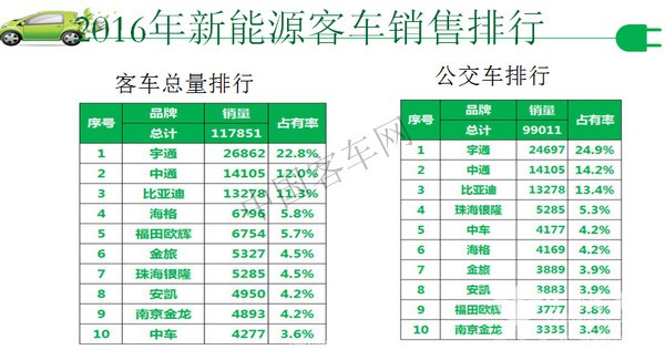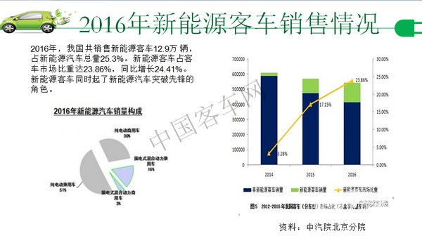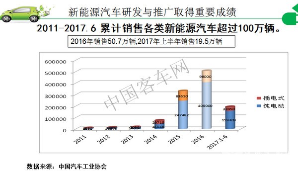 我国新能源汽车经过十几年的历程,已经取得了非常好的成绩,从2011年至今,累积各类新能源汽车的总销售量已经超过百万辆。以去年的数据来跟国外的情况做对比,我们可以看到,中国的新能源汽车的销量已居世界首位,我国是世界上新能源汽车推广最多的国家。同时成长出一批很优秀的汽车企业,去年全球销售万辆以上的新能源汽车企业总共有17家,我国占到了9家。新能源客车也是世界推广数量第一,2016年我国共销售新能源客车12.9万辆,占新能源汽车总量的25.3%,就是说我们新能源汽车的1/4是新能源客车。而新能源客车又占客车市场的23.8%,也将近1/4,同比增长24.4%。应该说新能源客车在我国新能源汽车产业发展过程中扮演了先锋角色。尤其在新能源汽车推广初期存在很多困难,包括产业的准备到消费者的接受,这个过程我们都经历过,最开始突破的走出来的是客车,客车起了一个先锋突破的作用。这里列出了2016年新能源公交车销售排行榜,宇通、中通、比亚迪、银隆、中车这几家应该说是排头兵。中国现在具有世界最大的客车市场与客车产业的规模,中国客车产业长期坚持着自主创新的发展道路,尤其是清洁能源客车领域创新非常活跃,技术水平总体来说,应该属于国际领先,这是我个人的判断,也是许多同行的公识。就整个汽车工业水平,我们在世界上还是属于追赶的状况,近十多年来中国汽车工业在飞速的进步,客车也十分突出,客车的技术创新在世界上我认为是做的非常好的,包括天然气客车、液化天然气客车、纯电动客车、混合动力客车,插电式混合客车。我国的12米混合动力客车燃油经济性能够做到20升/百公里的水平,在世界上是处于领先水平的。新能源客车的发展也带动了新能源汽车用电池、电机、电控等关键零部件的发展,为整个新能源汽车的发展打下了基础。我只找到2016年上半年的数据,大家看到,客车所用的电池占整个汽车动力电池的出货量的一半,就是相当于说,占销售量约1/4的客车,用了整个电池量的一半,所以说电池产业这几年的飞速发展,很大一块功劳应该属于客车,是客车把电池产业带动起来了。新能源客车的发展为整个中国新能源汽车产业发展做出的重大贡献,功不可没。