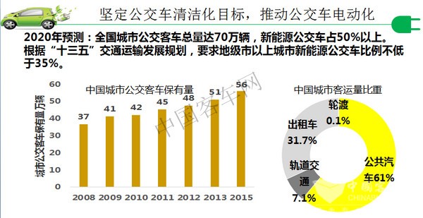 马凯副总理最近再次强调,要坚持发展新能源汽车国家战略不动摇。新能源汽车产业上升到国家战略的原因大家都很清楚,我在这里再罗嗦几句。我理解是三大要素:能源安全、环境保护和产业升级。先讲环境保护,严峻的雾霾压力,坚定了我国要发展新能源汽车的决心。我这里特别列出去年12月20号前后全国大面积雾霾的资料,我们在座的大概都经历过。这张照片是我那天中午在济南火车上拍的,中午时分就像晚上一样。大气环境治理如果不能解决,中国人民的健康没有保障,对整个中国来讲,就是一个压在众人心上的一块石头。有关部委已经提出公交车清洁化的目标,到2020年全国城市公交总量70万辆里头的50%必须是新能源公交车。十三五的交通运输发展规划,要求地市级以上城市新能源公交比例不低于35%。第二个要素就是能源安全。我国石油进口数量越来越多,随着我们汽车保有量的增加,石油的需求量不断增加,并越来越多的进口国外的石油,目前我们的对外的石油依赖度已经达到了65%,预测到2020年还会增长到68%,到2030有可能达到74%,这么高的数字实际上存在着很大的潜在安全问题,平常不会感觉,一旦世界上有战事发生就可能马上影响到我们的石油供给,所以这也是一个非常重要的事情。第三个要素是产业升级。中国现在是汽车大国,但还不是汽车强国,表现在我们的研发实力跟国外的还存在较大的差距,自主品牌的乘用车仅占国内市场的一半,而且多数是偏于低端产品,很多汽车核心零部件不是中国企业生产的,传统汽车的关键零部件核心技术缺失是一个非常严重的问题。我国基本上不具备出口参与国际市场竞争的能力,2017年整车出口到目前为止才80万辆,一个微不足道的数目,所以说明我们现在只是大国,不是强国,这个状态我们必须改变。客车行业同样责任重大,尤其是对城市大气环境的影响更为突出。所以发展新能源客车绝不是短期行为,我们要面对困难,坚定开发推广新能源客车的决心。