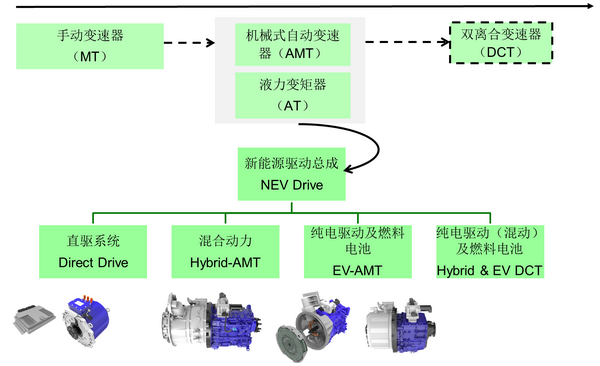 另外,我们再看看中国商用车自动化发展的技术路线。我们这里的自动化趋势不是指自动驾驶,而是专指解放司机频繁选换挡和离合器操作的驱动系统自动化趋势。