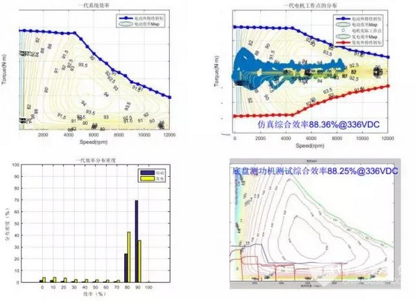 上图是某款电动车驱动电机在NEDC工况运行情况,左上方是电机的性能图,右下方是电机在NEDC工况下综合运行的状况。通过分析来说明大概电机在哪个区间如何运行、效率是多少。可以看出,在NEDC工况下,电机并没有运行在其最高效率区域,但是如果电机高效区的面积增大,扩展到NEDC工况运行区域,那么对降低NEDC工况下能耗是有利的。因此,设计和评价电机的优劣,取决于我国的汽车循环工况。根据工况需求去设计产品会更节能,然而大家都希望汽车的动力性好,因此汽车大部分动力总成设计都是过度设计。车辆动力性需要很大的功率和转矩,如果用NEDC循环工况来评测车辆,实际运行工况是只需要峰值的20-30%甚至10%以下的转矩/功率来运行车辆。然而质量重、百公里加速快的汽车都能量消耗高,这是节能汽车面临的挑战。