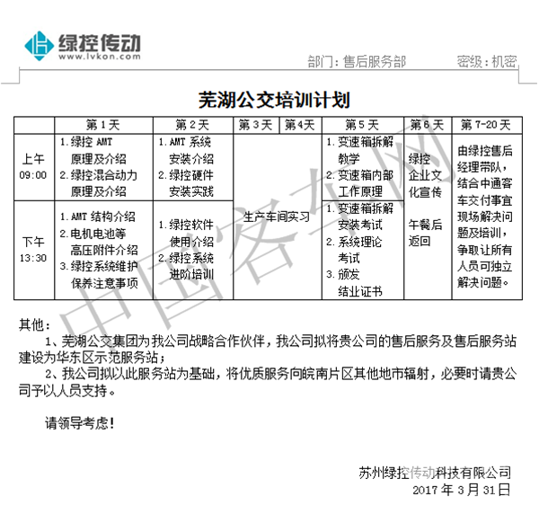 2、第二阶段成立临时工作小组,在新车到位后由零部件供应商培训人员带领我方维修人员队在新车现场进行为期15-30天的上线调试和保障工作,最后评估培训效果。