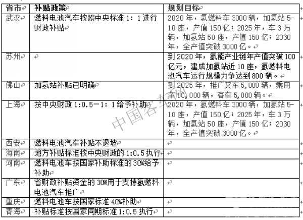 2016年12月30日,四部委联合发布了“2017年新能源汽车推广补贴政策”,其中动力电池客车补贴缩水,然而氢燃料电池客车补贴标准不变,轻型客车30万元/辆,大中型客车50万元/辆。目前各地政府也出台相应的补贴政策,多数地方燃料电池车补贴维持与国家补贴1:1的额度。在加氢站建设上,对符合国家技术标准且日加氢能力不少于200公斤的新建燃料电池车加氢站,每站奖励400万元。加氢站建设不退坡。