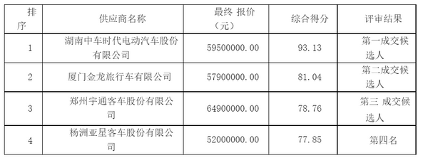 成交供应商名称:湖南中车时代电动汽车股份有限公司;