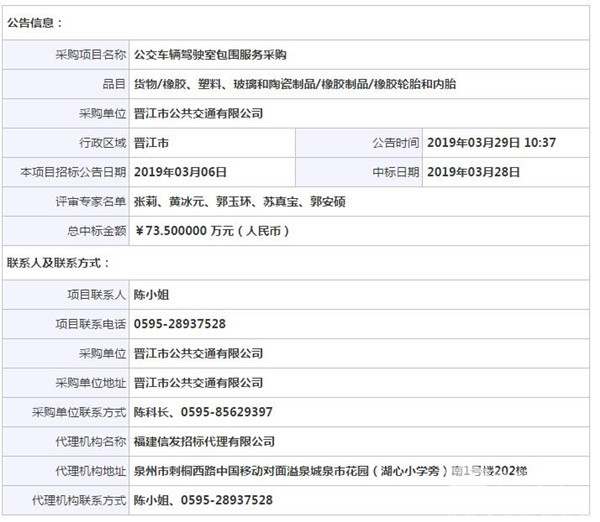 福建晋江公共交通有限公司公交车辆驾驶室包围服务采购中标公告