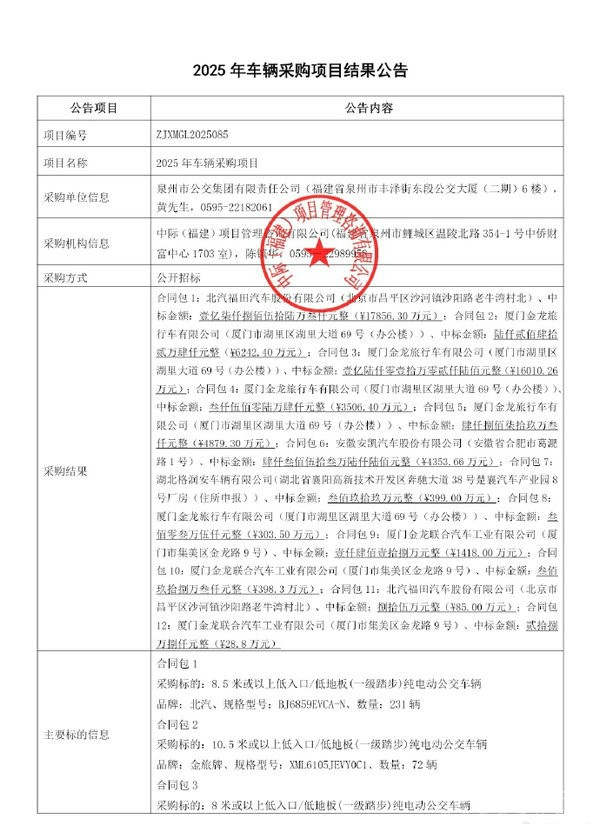 - 中标5.6个亿!泉州公交集团发布2025年公交车采购中标公告