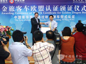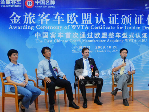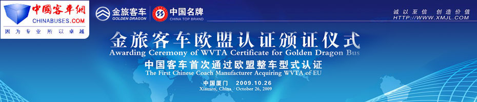 2009年10月26日,金旅客车荣获欧盟整车型式认证证书的颁证仪式在厦门金旅公司隆重举行,TüV德国莱茵中国集团南中国区交通服务部总经理Oliver Rothert特地到场祝贺,金旅公司叶宏廷总经理等主要领导出席了颁证仪式。
