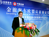 今天,我非常荣幸代表TUV莱茵中国站在这里,祝贺与金旅公司的合作取得了非常好的成绩!荷兰颁证机构RDW也委托我向金旅公司表示祝贺,因为金旅的第一张整车形式证书是在荷兰申请的。2008年4月,当我和....【更多】