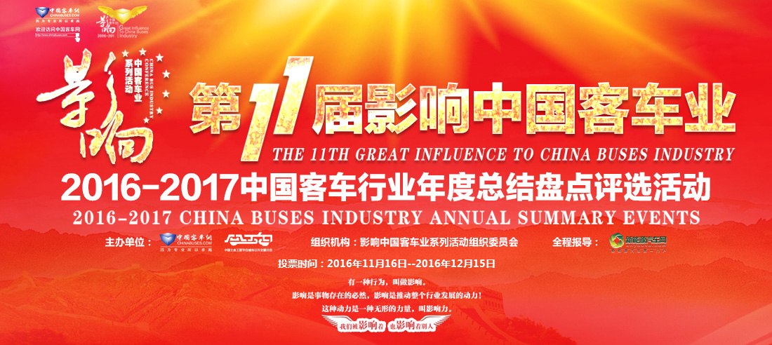 第十一届影响中国客车业•2016-2017中国客车行业年度总结盘点评选活动包括客车十大新闻、客车最佳雇主、影响力之星、推荐新能源客车、推荐中型客车、推荐技术配套六大板块,将通过“采访调查、网上评选、读者评论、专家推选”的方式揭晓评选结果,意在寻找中国客车细分市场的领先者,寻找优秀客车零部件技术创新者。