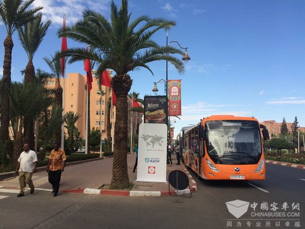 联合国气候变化公约第22次缔约国大会从2016年11月7日持续到18日,中国武汉制造的扬子江纯电动城市客车将全程服务本次大会,专门用于每天接送参会代表往返酒店、会场。预计12天内将接送来自全球近200个国家的参会代表。2016年11月7日,中国发改委参会代表和当地官员在马拉喀什乘坐扬子江纯电动城市客车前往会场,当了解到这是中国扬子江牌的时候,感到非常欣喜和自豪。