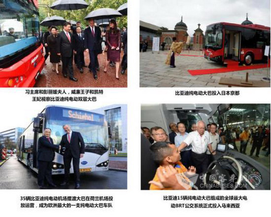 在海外,比亚迪纯电动大巴已然成为了“中国制造”的代名词。早在2011年10月,比亚迪在美国加州洛杉矶建成北美总部。2013年5月,比亚迪在美国加州兰开斯特建设电动大巴和电池工厂,并于2014年4月迎来首台纯电动大巴下线。2015年2月,K9纯电动公交车漂洋过海,成功登陆日本东京,成为首个成功进入日本市场的中国汽车品牌。2015年6月,在马来西亚总理纳吉布的见证下,由比亚迪15辆纯电动大巴组成的全球最大电动BRT公交系统正式投入马来西亚。2015年11月,35辆纯电动机场摆渡大巴在荷兰机场投放运营,成为欧洲最大的一支纯电动大巴车队。