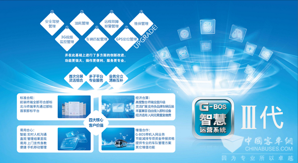 2010年,苏州金龙推出历时三年研发的G-BOS智慧运营系统,该系统利用科技手段助力车辆的节能减排和安全管理,客户实际使用后,车辆普遍达到3%-10%左右的节油率。G-BOS的诞生,标志着苏州金龙从客车产品制造商向客车运营管理解决方案提供商的战略转变。目前,应用G-BOS的客车运营企业达2000多家,装车数量超140000辆。