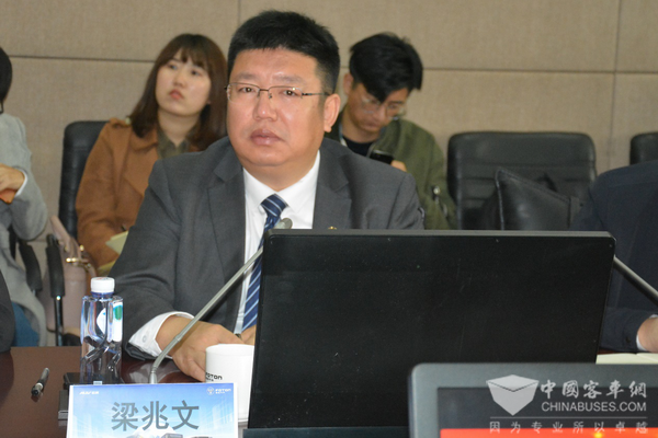 福田商用汽车集团高级副总裁兼欧辉客车事业部党委书记、总裁梁兆文主持会议